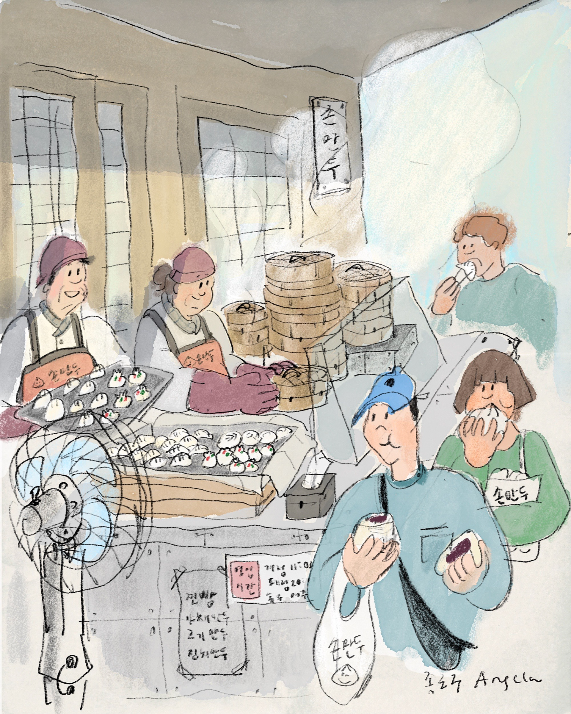 A cozy dumpling shop in Seoul, where the steam rises from freshly made dumplings.