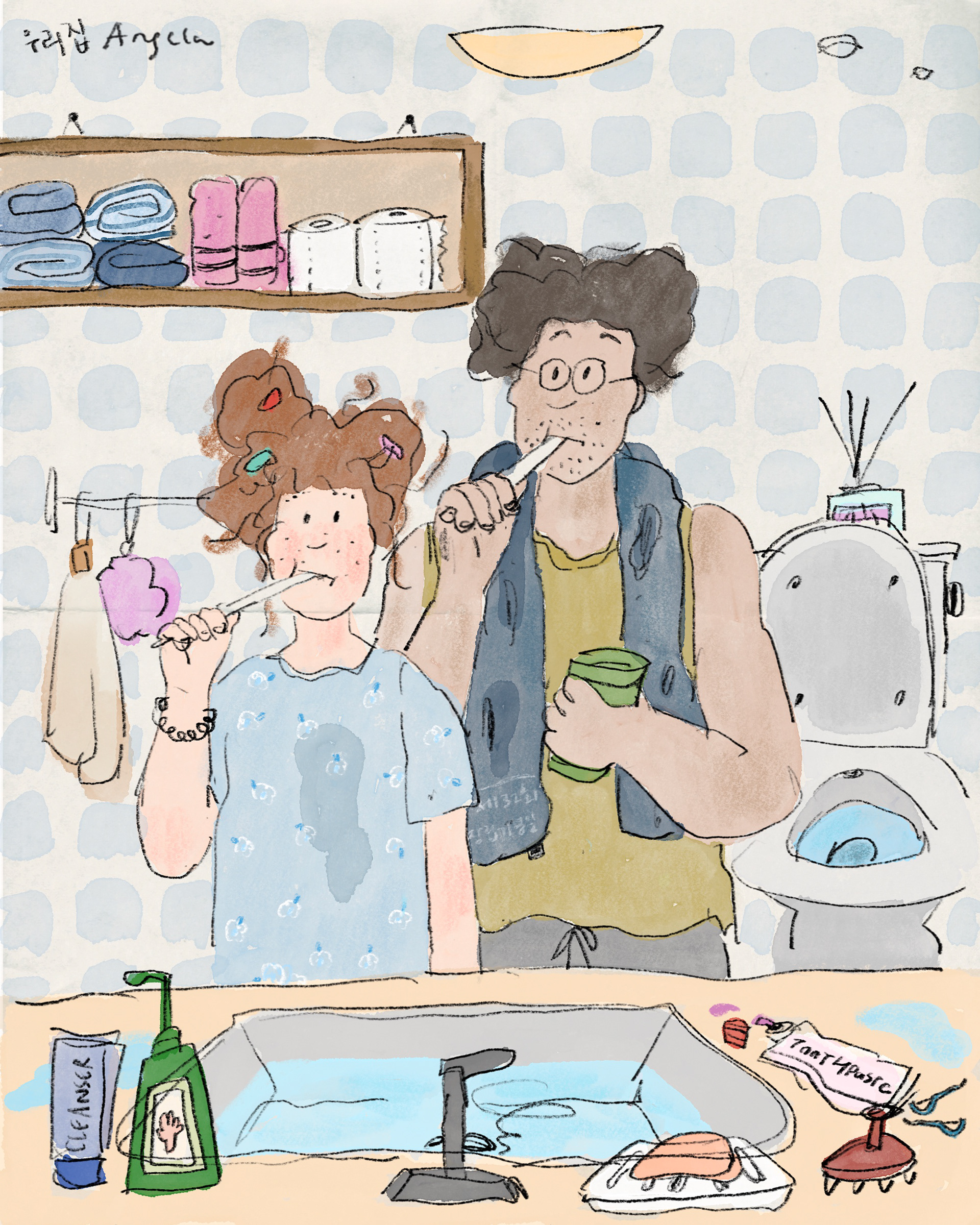 A sleepy start to the day — messy hair, half-open eyes, brushing our teeth side by side.