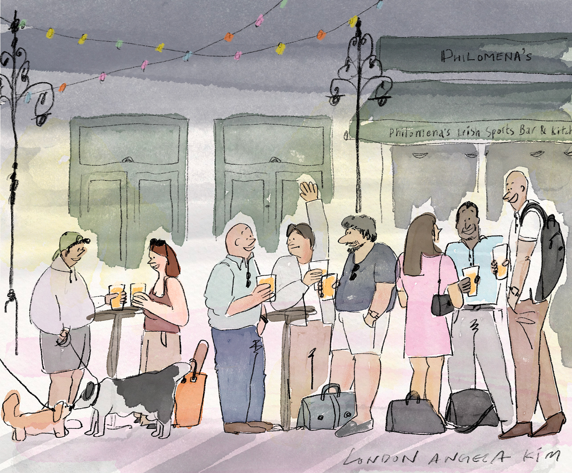 Everyone stands outside, beers in hand, enjoying the gentle breeze.