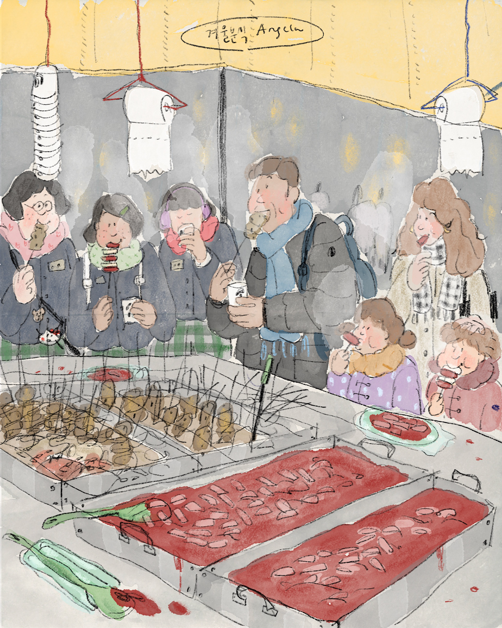 The menu of food trucks in Korea is mainly tteokbokki and odeng. The spicy and chewy tteokbokki is always delicious, no matter when you eat it. It's especially fun to eat it on a chilly day, holding a spicy tteokbokki in one hand and a hot odeng soup in the other, blowing on it to cool it down.