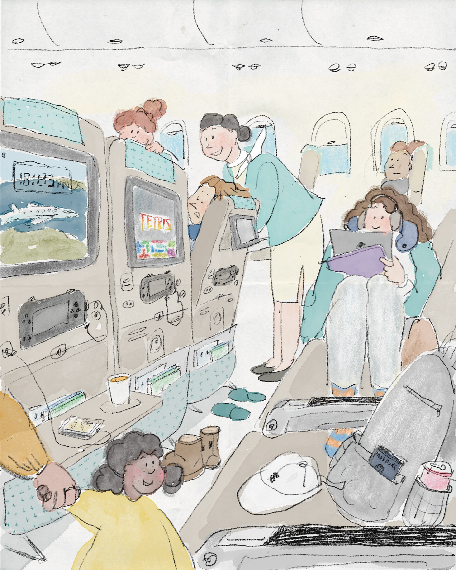 The plane hums softly as I gaze out the window, clouds drifting by.