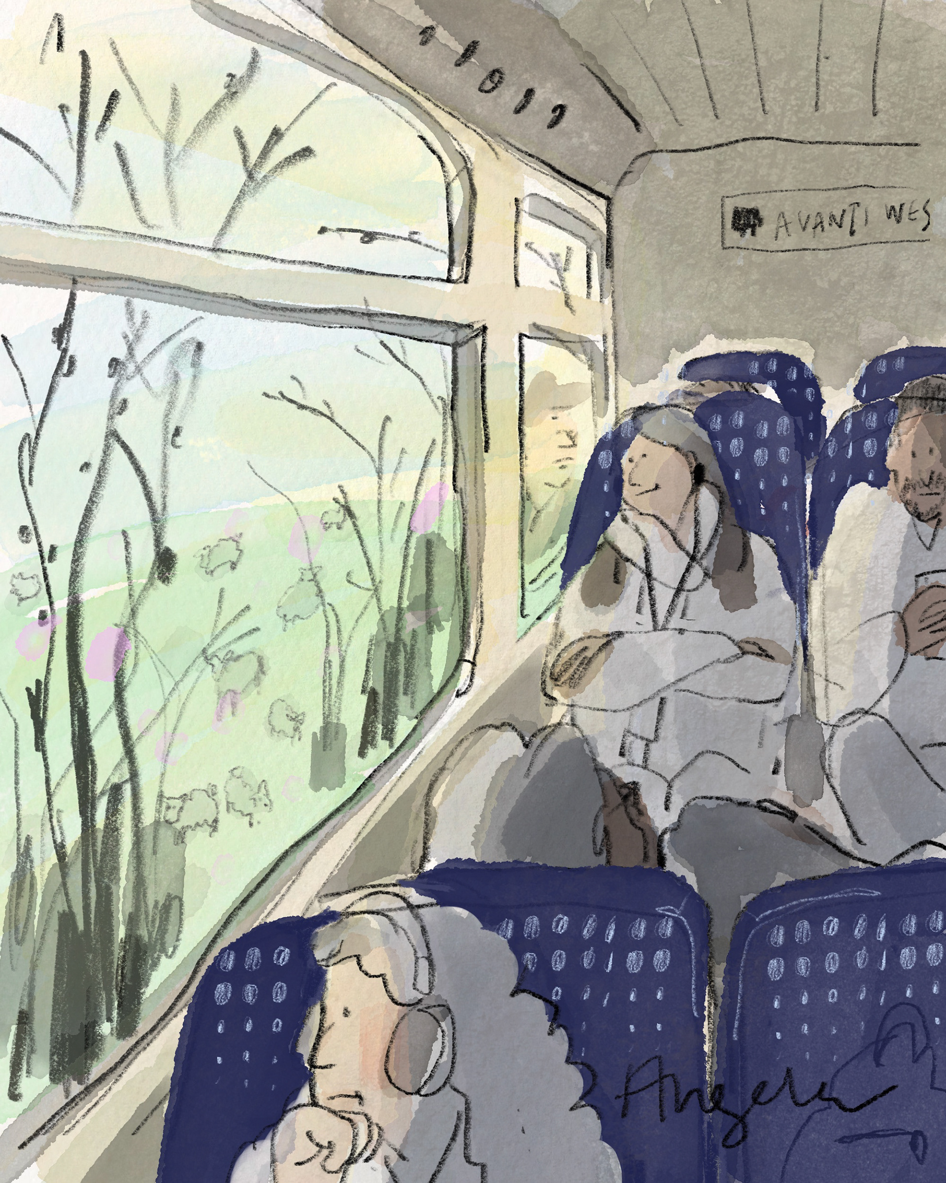 This is the scene inside a train traveling from Manchester to Liverpool. Being the city of The Beatles, listening to their songs while gazing out the window makes it feel as though all the worries in my mind disappear.